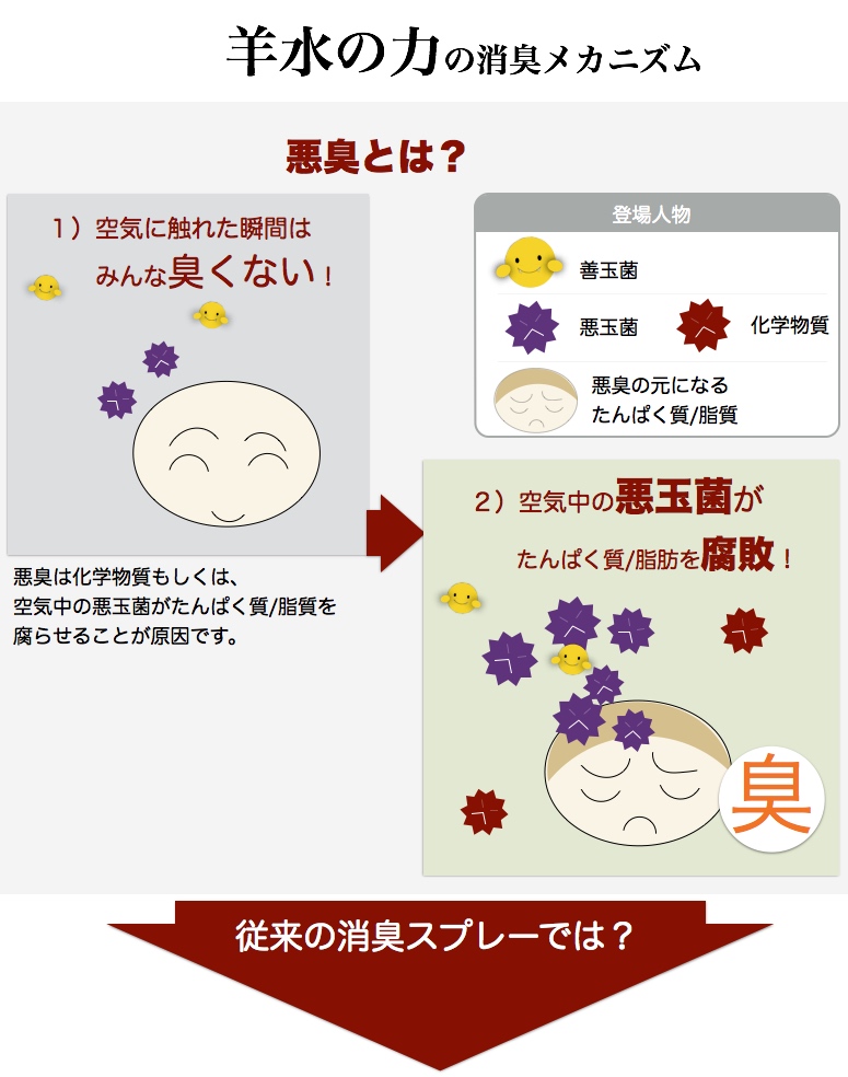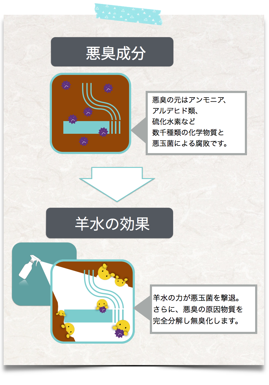 | 羊水の力は腐敗を止め、 化学物質を完全分解で無臭化する |