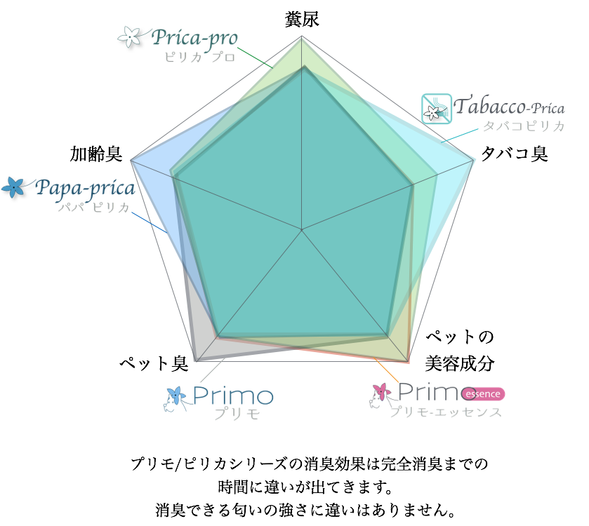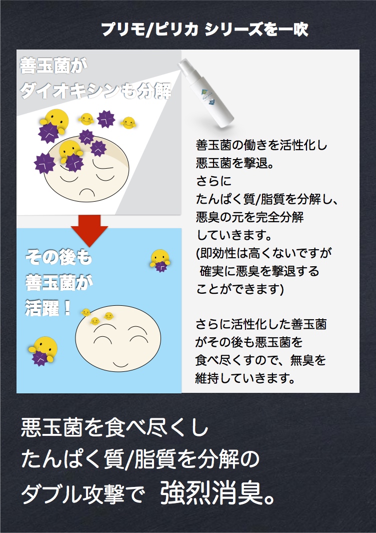 | プリモ/ピリカシリーズは特許(日本国特許第3656119号) を取得した新しいバイオ技術が実現した 全く新しい除臭剤です。 | |||